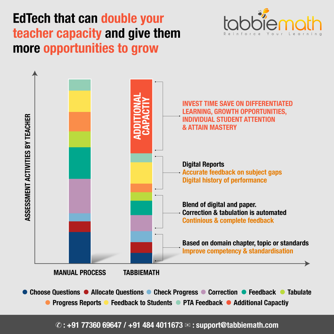 Tabbie automated activities that would otherwise be performed by teachers manually. We have created more than 120,000 items across 1800 topics in an evolving task bank and made them easily searchable based on chapter and rigor so teachers can easily choose items from our task bank and send to students for practice. Work completed by students is corrected, marks tabulated, and data presented back to teachers for remediation analysis.