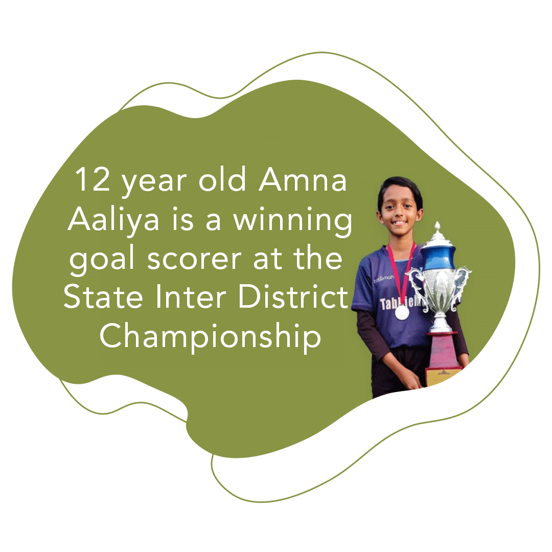 Amna is a grade 7 student selected through Tabbie’s state wide football talent search program. She has been attending our training clinics for the last 24 months and recently won the best player award in the whole of Ernakulam district. To ensure we gets regular training and better schooling, we recently helped her get a seat at Sacred Heart School a very good rated school in the city.